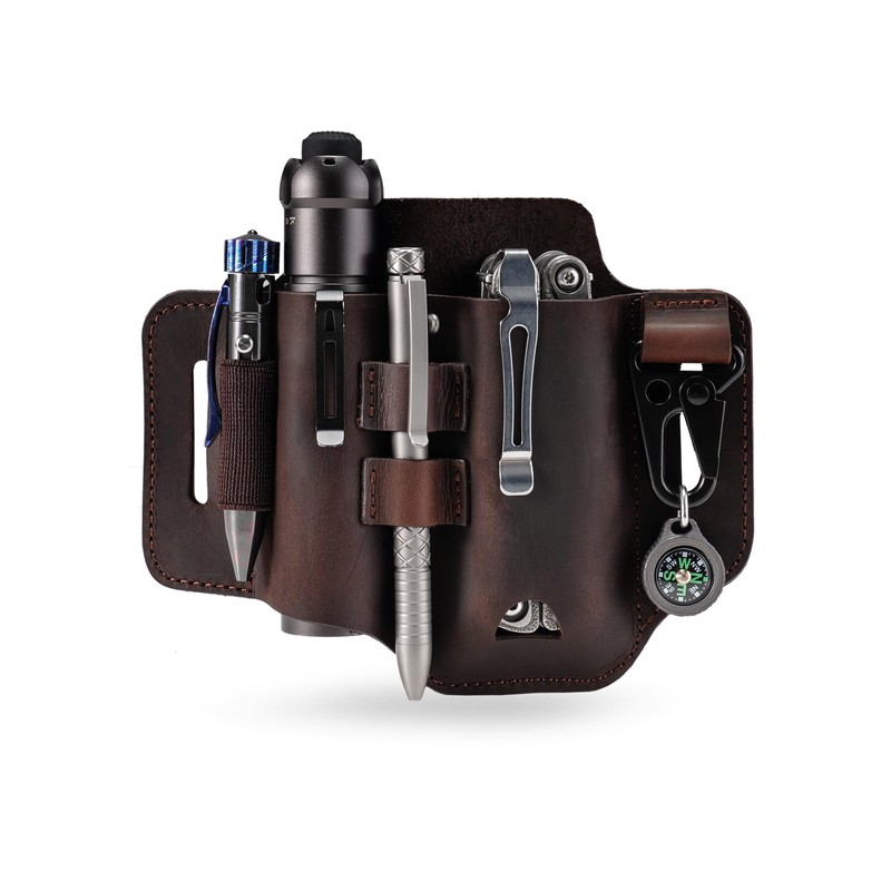 - Versatile Design: This EDC gear is designed to fit most multitools, flashlights, pens, and keychains. It is compatible for Leatherman multitools like Signal, Rebar, Surge, Charge, Wingman, Free P2, and Wave knife. The compact size and lightweight design make it the perfect leather belt EDC pouch for everyday carry (EDC).