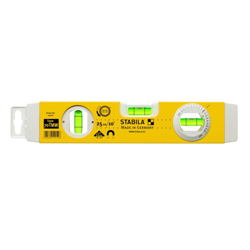 Stabila 70TMW Torpedo Level with magnetic base and additional angle finder vial. Length: 250mm (10 in).Stablia Torpedo Level, is a sturdy level with two shockproof vials (one horizontal and one vertical). Has an epoxy locked top frame and a lasting accuracy of 0.029° = 0.5mm/m in vial up position.