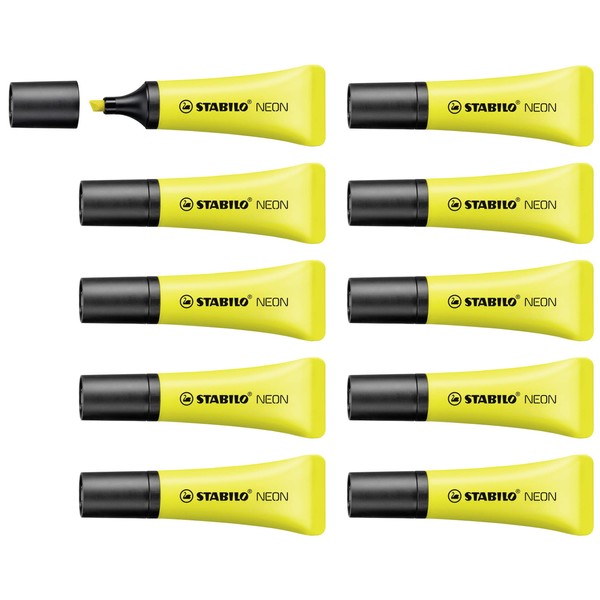 Stabilo Yellow Highlighters (Pack of 10) These innovative Stabilo Neon Highlighters feature a unique soft tube design for comfortable use. The bright neon ink is water based to prevent drying out and to remain vibrant on the page. The chisel tip nib produces a 2-5mm line for neat underlining and bold highlighting.