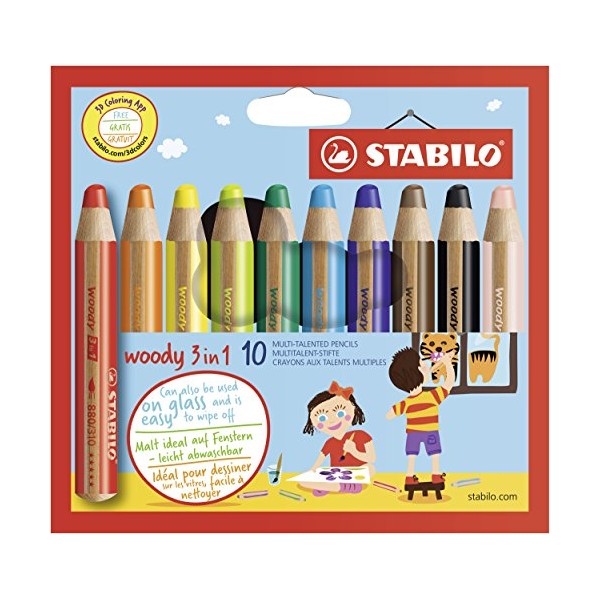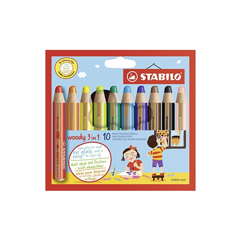 STABILO 880/10 Woody 3-in-1 Multi-Talented Pencil - Assorted Colours, Wallet of 10