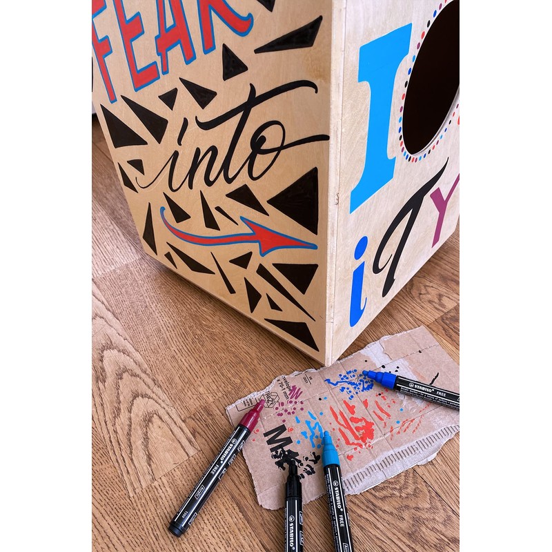 - Paints on a variety of surfaces, e.g. paper, cardboard, canvas, stone or faux leather