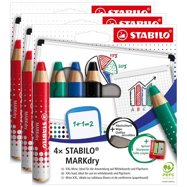 STABILO Markdry Set of 3 Cardboard Cases x 4 Marker Pencils + 1 Sharpener + 1 Clothaa