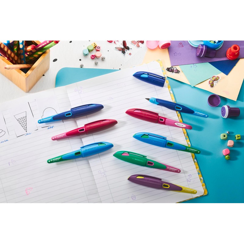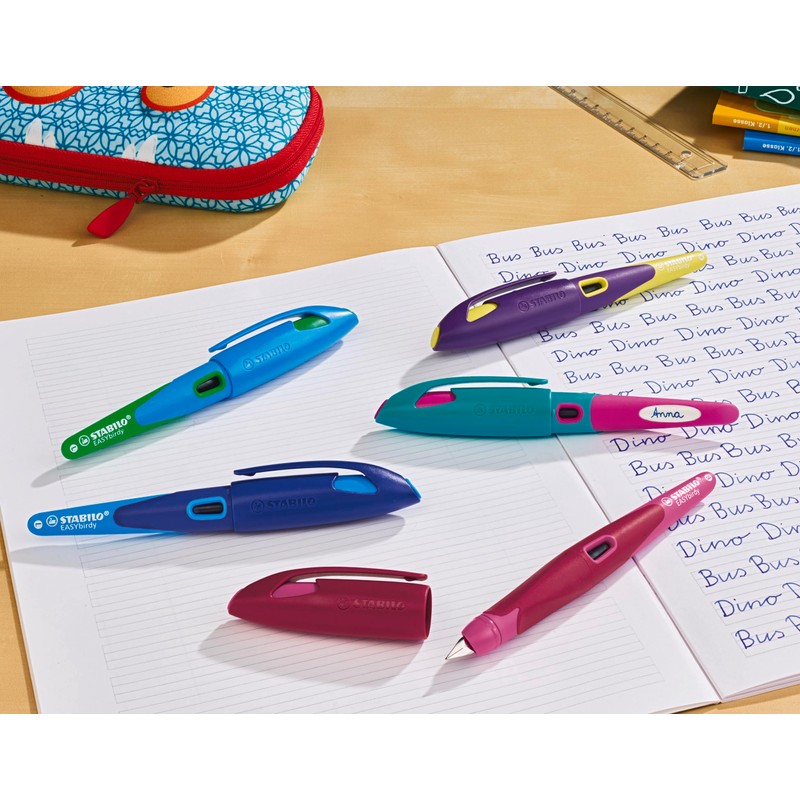 Den ergonomischen Füller mit der rutschfesten Griffzone gibt es in speziellen Versionen für Links- und Rechtshänder. Das Besondere am STABILO EASYbirdy ist ein einzigartiges Feature: Durch den um 30 Grad verstellbaren Winkel der Feder passt er sich der individuellen Handhaltung der Kinder an, so dass die Feder immer möglichst gerade auf dem Papier aufliegt und ermöglicht so eine leichtere Schreibführung. Das Ergebnis ist ein sauberes Schriftbild, ganz ohne Klecksen und Kratzen. Zudem sind die Federn mit einem Schutzring eingefasst um blauen Fingern vorzubeugen. Den super robusten Schulfüller gibt es in insgesamt fünf Farbkombinationen. Damit die Kinder dabei den Überblick behalten, welcher Füller der eigene ist, hat der EASYbirdy ein Namensfeld.