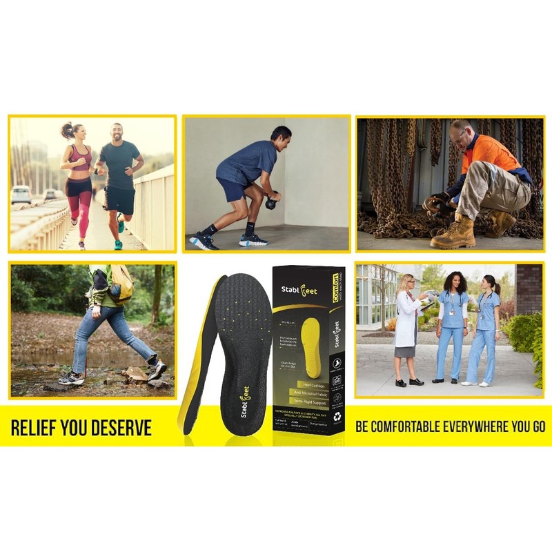 - Ultimate Foot Pain Relief - Say goodbye to sore feet with our plantar fasciitis relief shoe insoles for both men and women. These inserts effectively absorb shock and reduce impact, alleviating pressure on your heels as you walk, stand, or run, ensuring your day remains comfortable and pain-free.