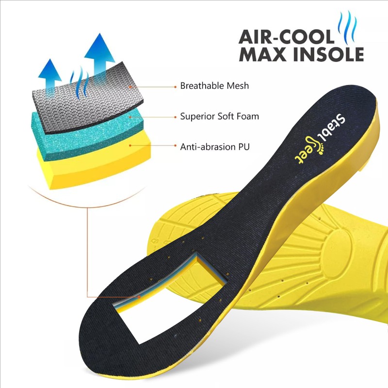 It is excellent for shock absorption and foot fatigue. The fabric also helps keep your feel cool for work boot insoles for men