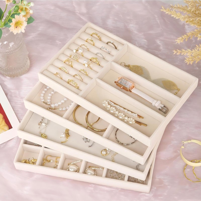ăStackable Jewelry Organizer Traysă- 4 jewelry trays are stackable, perfect for home storage, trade shows or retail shops, can be Stacked to create more space for storage; making jewelries well organized and orderly stored.