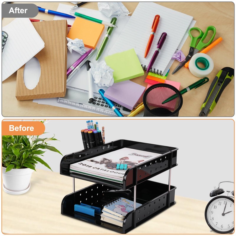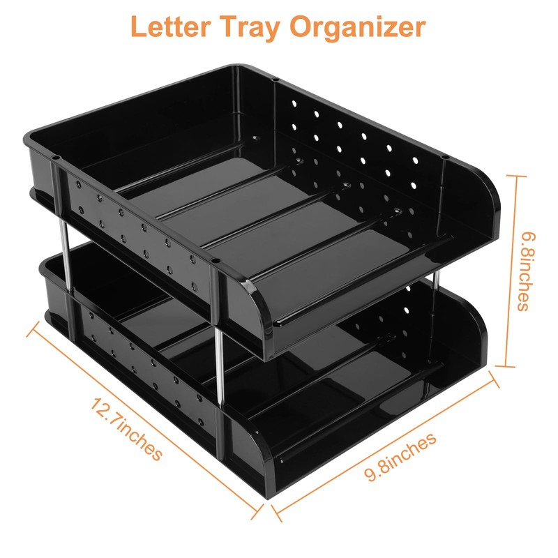 - Spacesaving Letter Tray Organizer: This letter tray organizer has open handles for easy access to your office supplies and files. It not only keeps your desk neat, organized and space-saving, but also helps you to solve the problem of cluttered desk and impossible to find files, thus improving your work efficiency