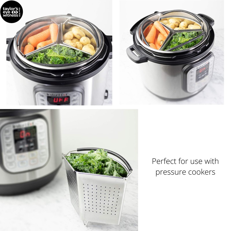 - ✅ PRESSURE Cooker ACCESSORIES: This 3-part divided steamer basket allows different food types to be cooked separately without coming into contact with one another, which is perfect for picky and fussy eaters. It is compatible with the major 3 and 6 Quart Pressure Cooker Brands. Will also fit 8 Qt with some room to spare.