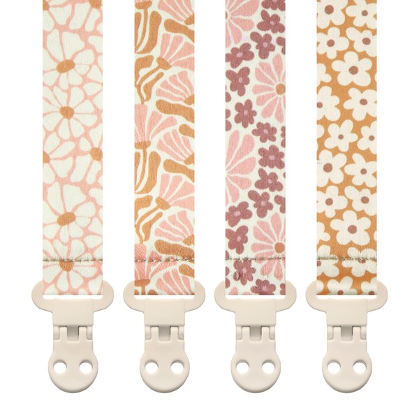 Stadela Baby Pacifier Clip Holder - Girl 4 Pack Gift Set – Boho Modern Pink and Beige Flowers Floral (Nolana)