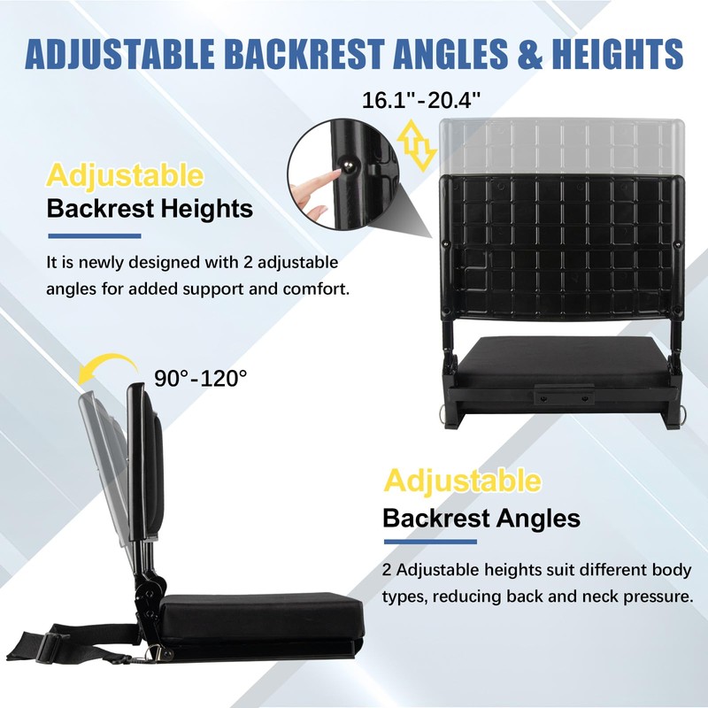 - Flexible Comfort Design - Unlike standard stadium seats with back support on the market, this stadium seat features a soft, extra-thick foam backrest with two adjustable angles(90° and 120°) and two height(16.1"-20.4") settings to suit various body types. Enjoy long-lasting comfort and support, free from pressure or fatigue, no matter how long you sit