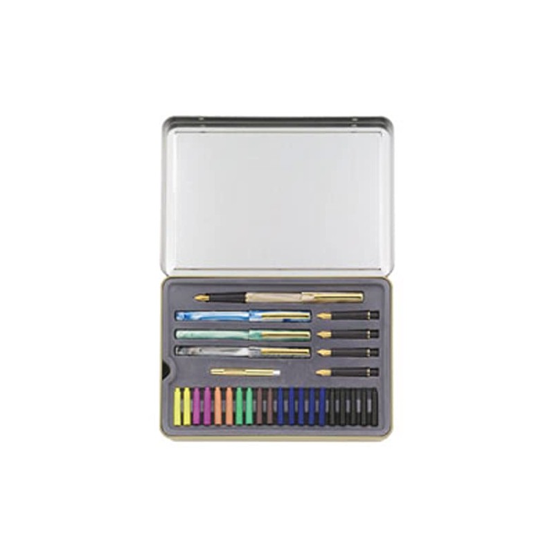 - Calligraphy pen set in convenient, travel ready metal storage tin! Develop your calligraphy skills in order to express your creativity through a wide range of lettering styles