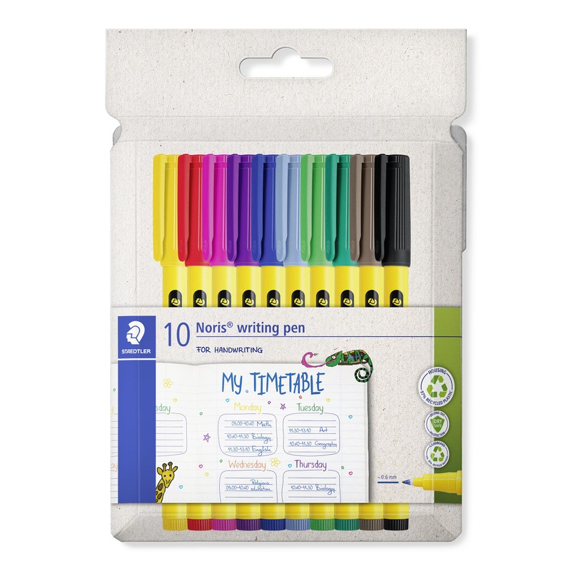 - Box contents: cardboard case with 10 Noris writing pen fineliner in assorted colours