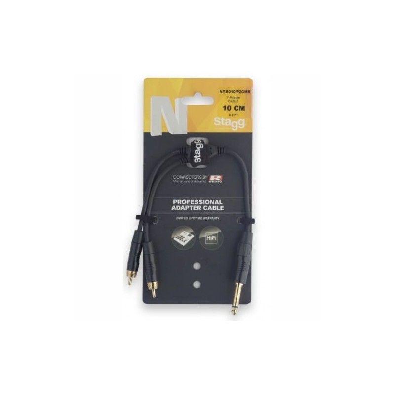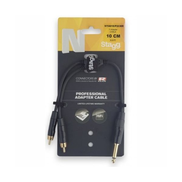Neutrik Rean Mono 4" Jack Male to 2 x RCA Phono Male Adapter Cable Part Code: AS-CA03403 Manufacturer: Stagg MPN: NYA010/P2CMR GTIN: 5414428214188 Unit: Packaging: Card Brand: Stagg Type: Adapter Cable Number of Ends: 1->2 #1 #1 : jack plug 6.35 mm (1/10.2 cm) male connector 2: RCA plug specification: shielded 6.0 mm OD OFC conductors made of oxygen-free copper, length: 0.1 m (10) colour: black