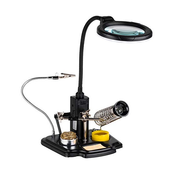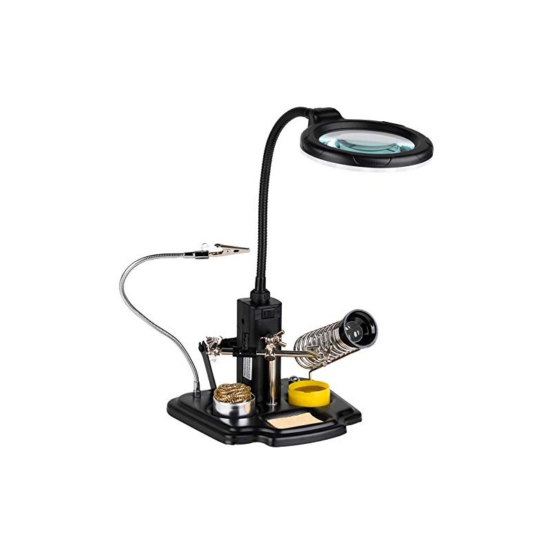 - Includes soldering iron stand, alligator clips, soldering wire spool holder, sponge, rosin, as well as cleaning ball, to help with soldering