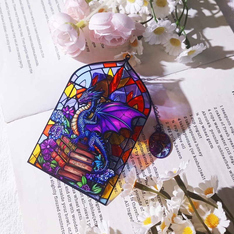 Stained Glass Dragon Bookmark with Charm, Fantasy Transparent Metal Book Mark for Reading, Purple Gothic Window Design Book Markers Dragon Lover Gifts for Women Men Kids School Office Supplies