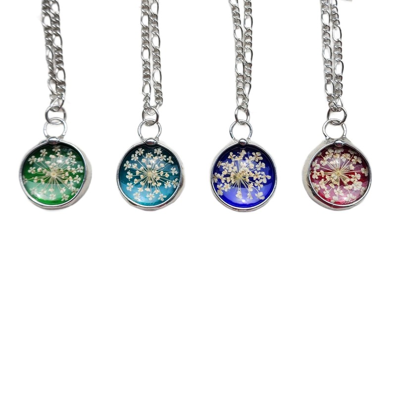 - Stained Glass Pendant: A delicate Queen Anne's Lace flower preserved in stained glass with dimensional detail and vibrant color.