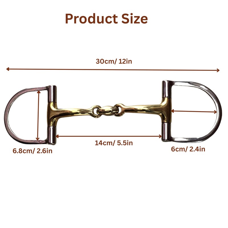 - Specification: Western riding German stainless-steel Bit has total length: 30cm/12in, Inner Length: 14cm/5.5in, Thickness: 1.2cm/0.5in, D ring: height 6.8cm/2.6in; ID:6cm/2.4in