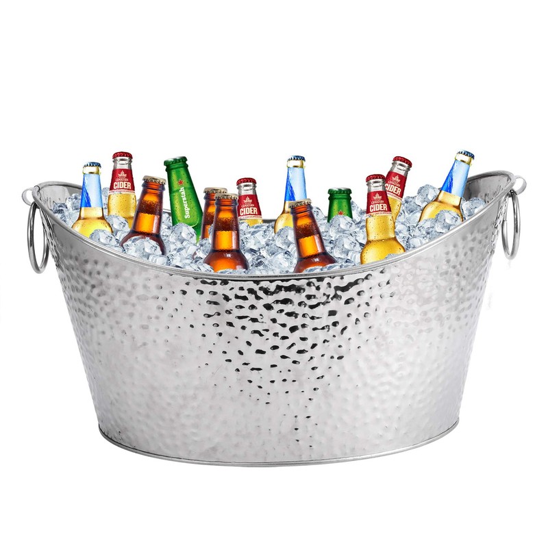 Keep all of your favorite beverages chilled in this metal cooler. From beer to wine to champagne to soda, this drink bucket can do it all.