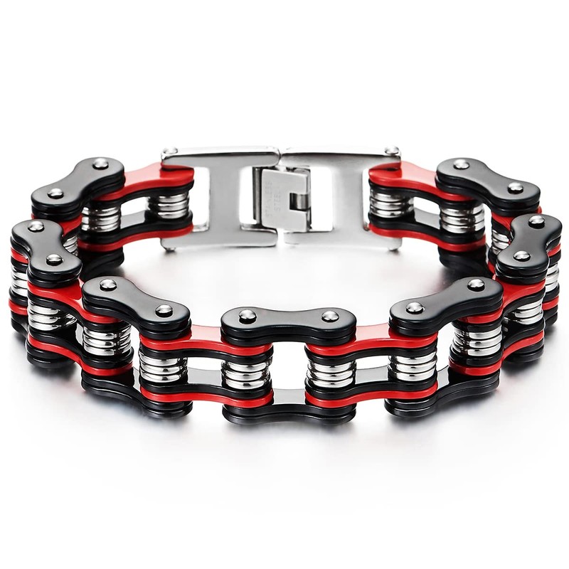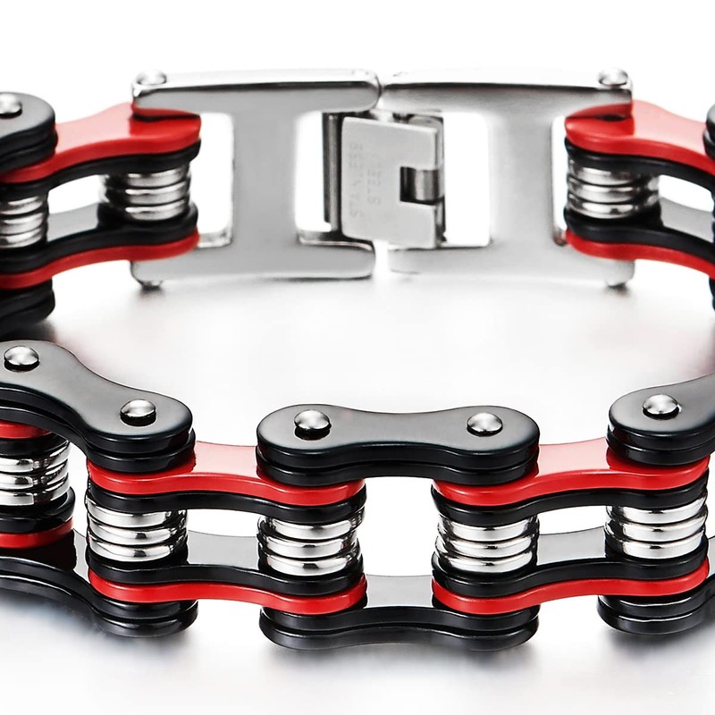 - Stainless Steel Biker Bracelet for Men, Masculine Motorcycle Chain Style, Silver Black Red Bike Link High Polished