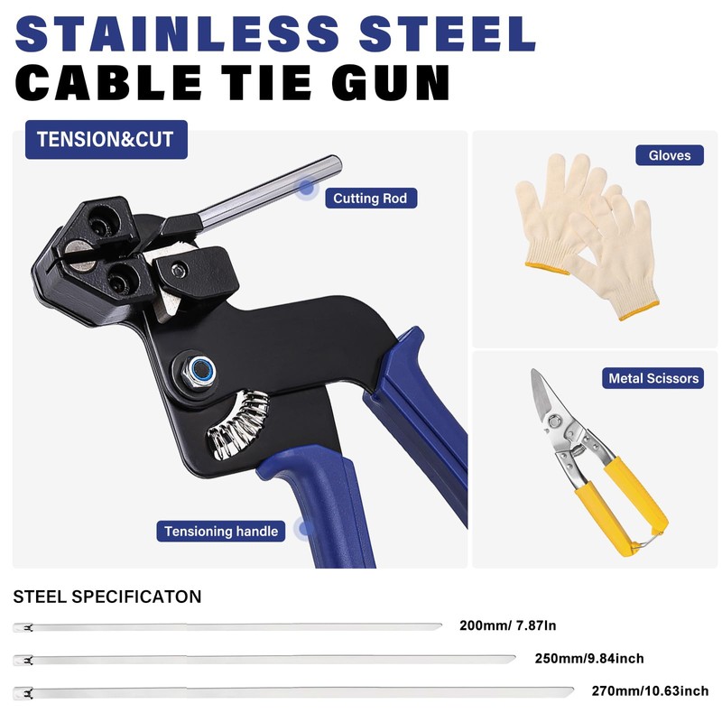 - Complete Cable Tie Gun Kit for Versatile Use: Includes a premium stainless steel cable tie gun, industrial-grade scissors, protective gloves, and 150 stainless zip ties in 3 different sizes, perfect for heavy-duty outdoor and indoor applications.