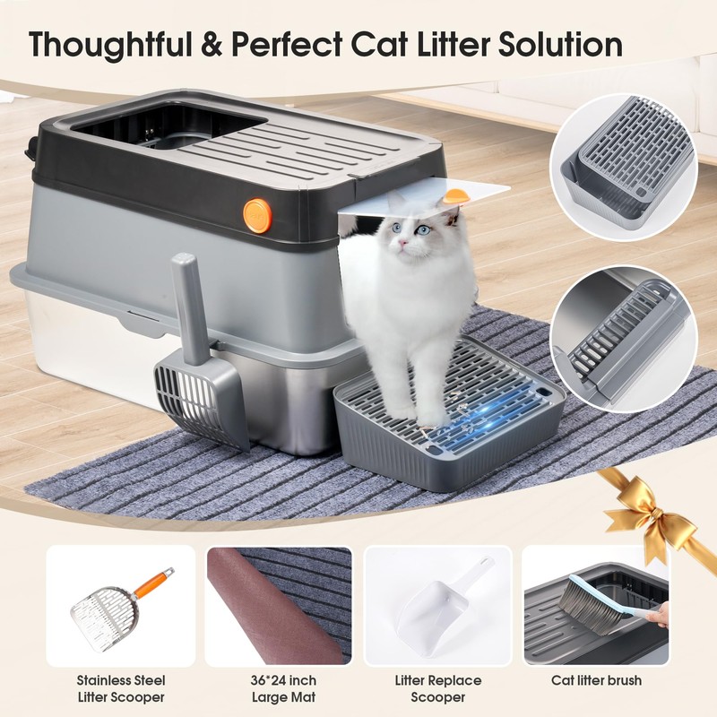 - SAY GOODBY TO BULKY, HASSLE PRONE CAT LITTER BOX – Our flip-top covered litter box makes cleaning a breeze! Simply press the button to open the top lid and shovel cat litter with ease—no more awkward angles or heavy lifting. Come with complete cleaning kit: Stainless Steel Litter Scoop, Litter Replacement Scoop,Litter Brush and Large Litter Mat to keep your floors clean.Upgrade your cat care routine with our all-in-one litter box solution—designed for convenience, efficiency, and a cleaner home!