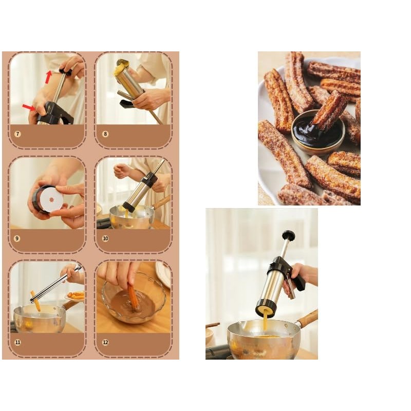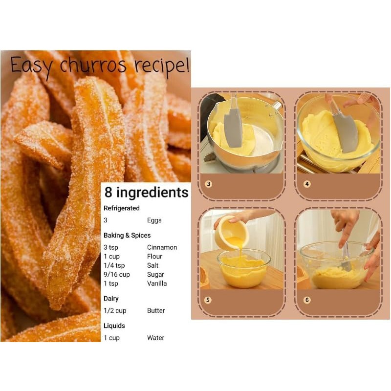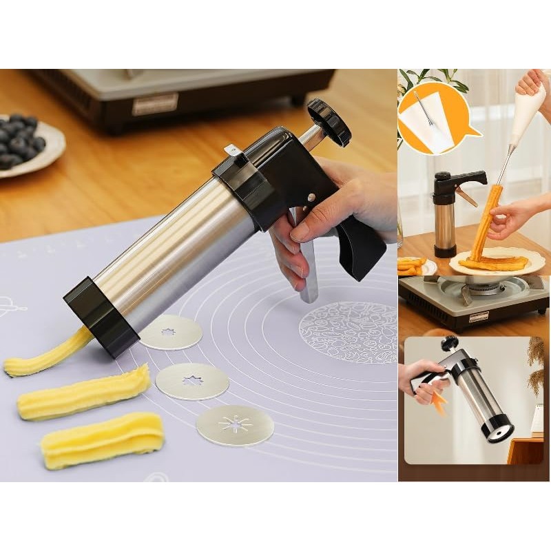 - Strong Construction: Churros-maker Made from high-quality materials, ensuring long-lasting performance and reliability. Silicone Spatula - Flexible spatula helps mix and scrape dough efficiently, 8 Nozzle Options - Create different churro shapes with 8 piping nozzles and 8 tips