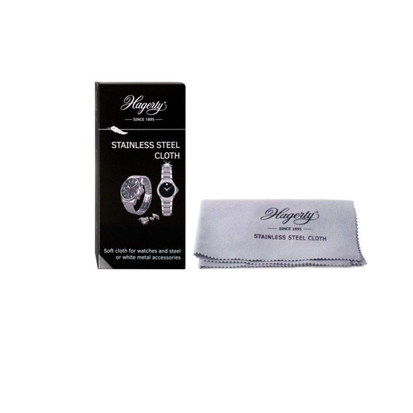 100% ecological cotton cloth, impregnated with Hagerty s exclusive formula, that quickly cleans and brings back the sparkle of stainless steel items: watches and accessories. Soft cloth that avoids micro-scratches and protects jewellery. How to use: Gently buff the objects with the cloth. Size: 30 x 36 cm