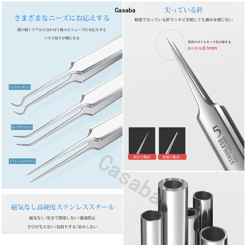 Stainless Steel Comedo Pusher, [Set of 3] Super Pointed Tip ≤0.002 inch (0.06 mm), Square Plug Tweezers, Precision Tweezers, Acne Removal, Germany Imported, Blackhead Removal, Acne Remover, Acne