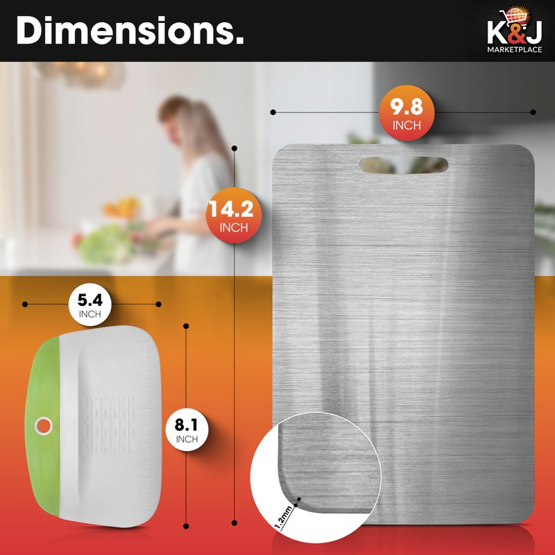 • [LARGE & DURABLE WORK SURFACE]: Measuring 14.2 X 9.8 In With A Pro Cutting Board Stainless Steel Quality Build , This Spacious Surface Of The Stainless Steel Chopping Board Is Perfect For Cutting Meats, Vegetables , And Even Kneading Dough. The Included Dough Slicer Adds Extra Versatility To Your Cooking Experience , Easy to Clean Cutting Board Dishwasher Safe , Clean Cutting Boards For Kitchen