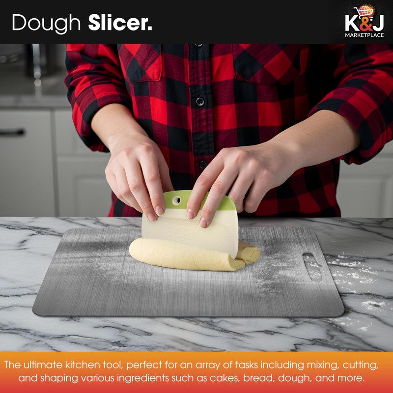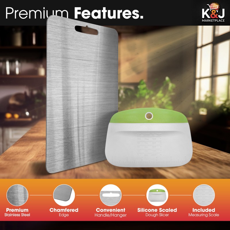- [SILICONE DOUGH SLICER INCLUDED]: Perfect For Slicing , Dicing , And Chopping , This Metal Cutting Board Also Includes A Dough Slicer For Precise Pastry And Dough Preparation , This Steel Cutting Board Is Great For Both Home And Professional Kitchens , Professional-Grade Stainless Steel Chopping Boards For Kitchen, Ideal For Slicing, Dicing, And Kneading , Multipurpose Cutting Board