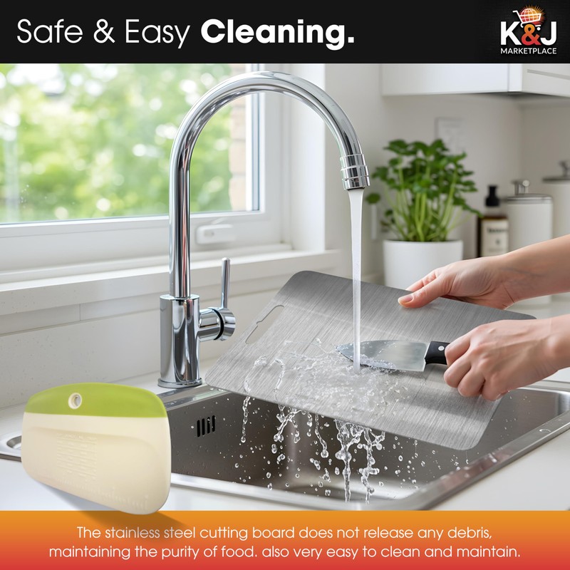 - [HYGIENIC & EASY TO CLEAN]: Unlike Traditional Wood or Plastic Boards , This Two Sided Cutting Board Resists Stains and Scratches , The Non-Porous Surface Of These Non Plastic Cutting Boards For Kitchen Makes It Ideal For Maintaining A Clean Kitchen Environment , Upgrade Your Kitchen With These Cutting Boards For Kitchen Stainless Steel – Clean, Knife-Friendly and Microplastics-Free