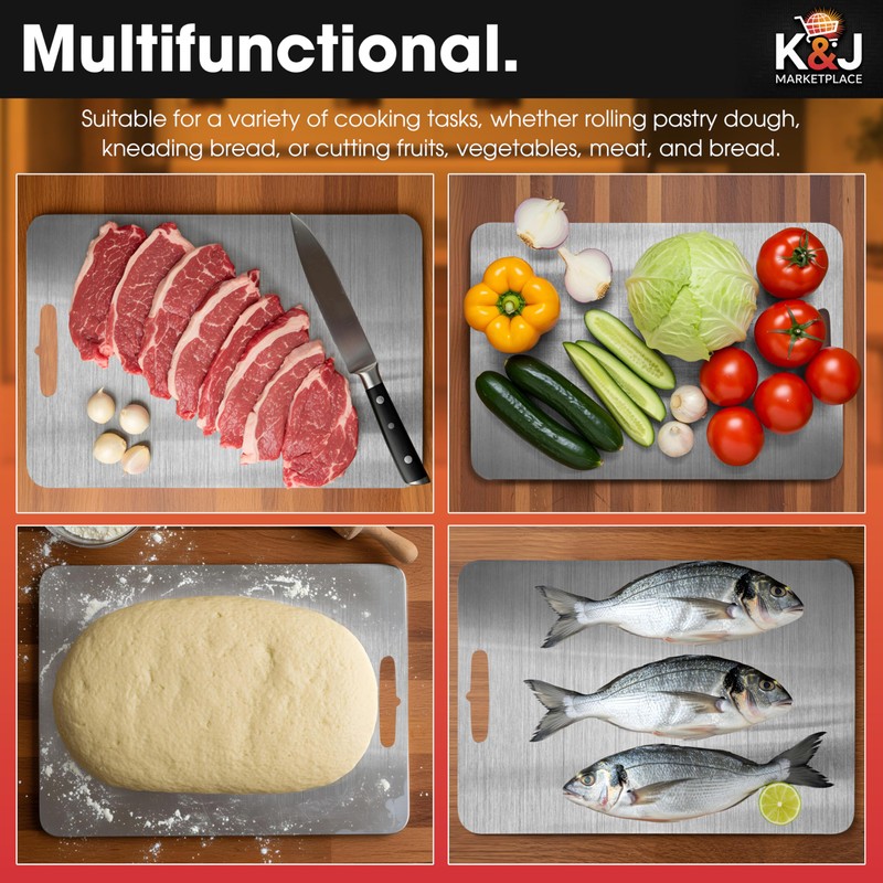 - [HEAVY-DUTY & BUILT TO LAST]: These Stainless Cutting Boards For Kitchen Are Designed For Durability And High-Performance Food Prep , The Stainless Steel Cutting Boards Construction Ensures A Strong , Long-Lasting Surface For Slicing Meats , Chopping Vegetables , And Even Kneading Dough , Its Sleek Design Adds A Modern Touch To Any Kitchen , Double Sided Stainless Steel Cutting Board