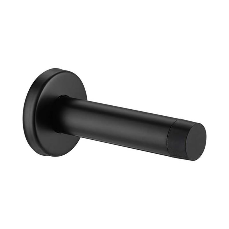 A sleek black stainless steel door stopper with a soft rubber bumper, designed to protect walls and reduce door impact.