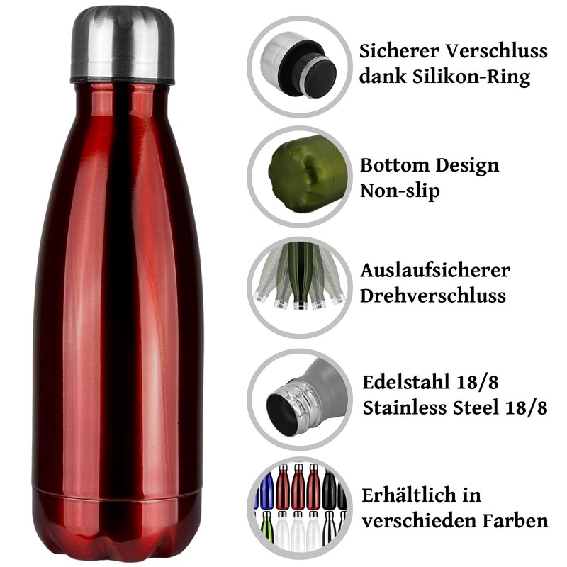 - Outdoor protection: the stainless steel drinking bottle with vacuum closure not only offers an excellent seal, but also a stylish way to stay hydrated while you are on the go. This metal bottle is the perfect companion for your sports activities and keeps your drink cool or warm for hours thanks to the vacuum seal. The 100% tightness and easy filling make it easy for you to drink anytime and anywhere. The practical drinking opening is ideal for dosed sips without spills.