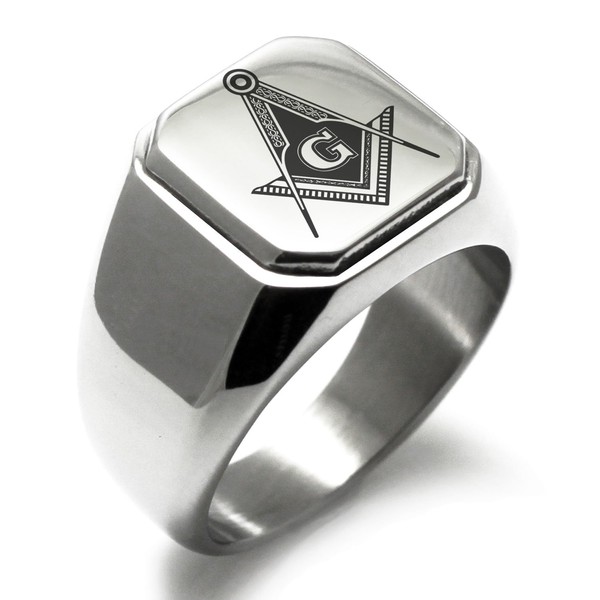 Stainless Steel Freemasons Masonic Royal Compass Symbol Engraved Square Flat Top Biker Style Polished Ring, Size Z6