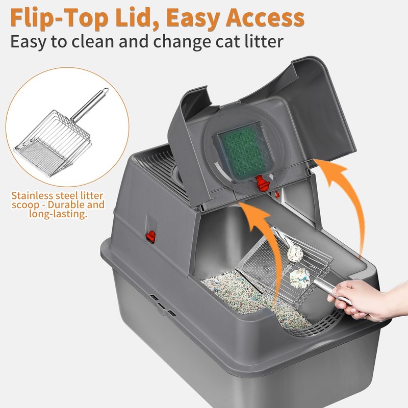 • Top-Flip Cleaning Convenience: With our stainless steel litter box, there's no need to remove the entire top cover, making your cleaning routine exceptionally easy without any awkward, hard-to-reach corners.