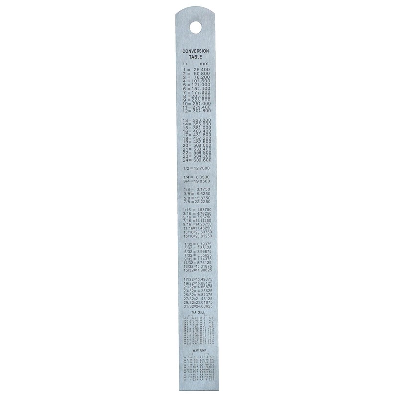 Comes with metric to imperial conversion tables as well as tap drill rules on the rear of the ruler.