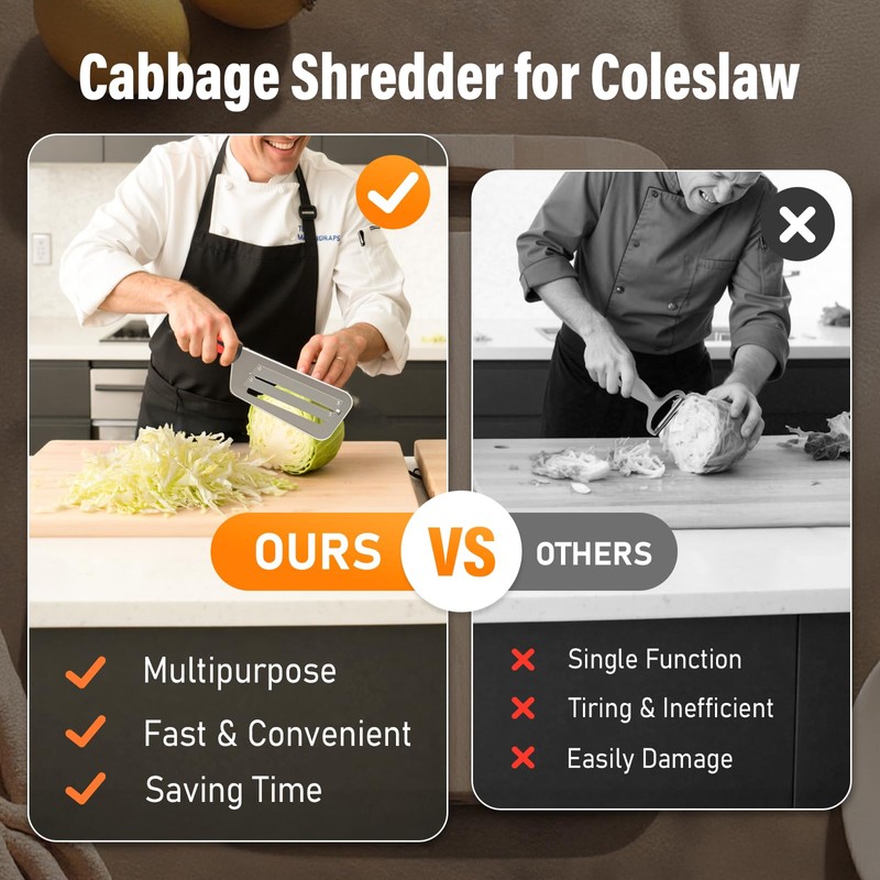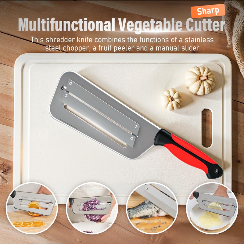 - MULTIFUNCTIONAL VEGETABLE CUTTER: This stainless steel shredder knife is a total game-changer in the kitchen. Except shredding cabbage perfectly for coleslaw. It also can be used to slice a variety of vegetables and fruit including lettuce, cucumber, carrot, potatoes, chili, onion, pears etc
