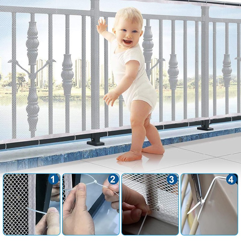 The mesh net for balcony railing can effectively prevent children's heads and bodies from falling out of the railing and toys from falling out of the gaps. It is suitable for indoor and outdoor use, e.g. B. For stairs, railings, cots, windows, doors, hallways, fences and balconies to ensure the safety of your children, pets or toys.