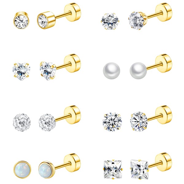Staligue 8 Pairs Flat Back Stud Earrings for Women Hypoallergenic Stainless Steel Earrings Set Flatback Cartilage Earrings (Gold)