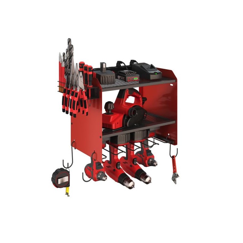 - GARAGE TOOL ORGANIZER WALL MOUNT - Easily store and charge cordless drills and other power tools while keeping hand tools and accessories like drill bits neatly organized with this 2-tiered power tool shelf.