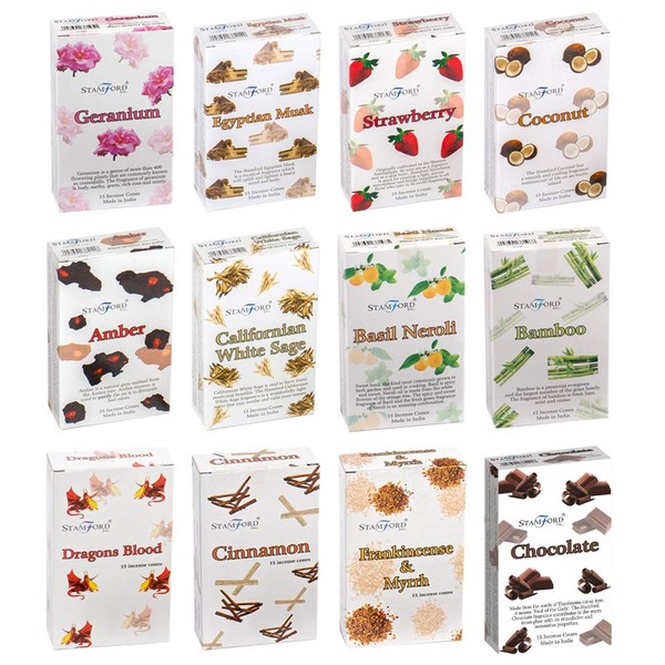 - Contents: 1 Pack x 15 Cones Each of Stamford Californian White Sage, Frankincense Myrrh, Cinnamon, Dragons Blood, Bamboo, Amber, Coconut, Strawberry, Egyptian Musk, Chocolate, Basil & Neroli, Geranium