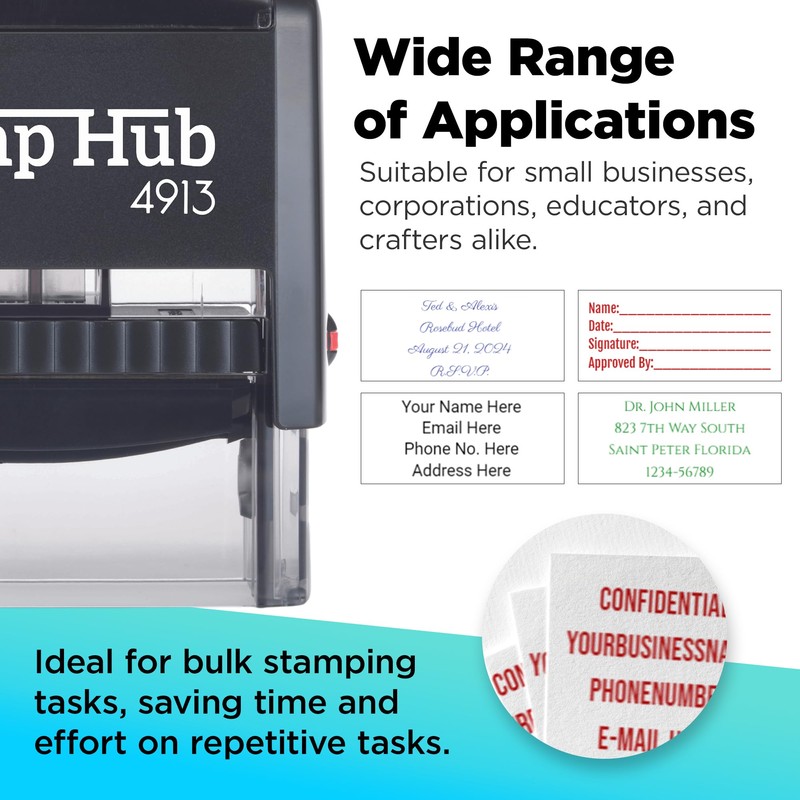 - Self-Inking Technology: Stamp Hub's self-inking stamps offer sharp, crisp prints with every use. Long-lasting ink pads provide thousands of impressions. Hassle-free, clean, and user-friendly, perfect for offices and professionals.