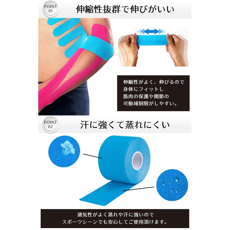- ✅【 汗に強くて蒸れにくい 】通気性がよいため蒸れや汗に強く、はがれにくいテーピングテープになっています。そのため、動きの激しいスポーツシーンでも安心してご使用いただけます。