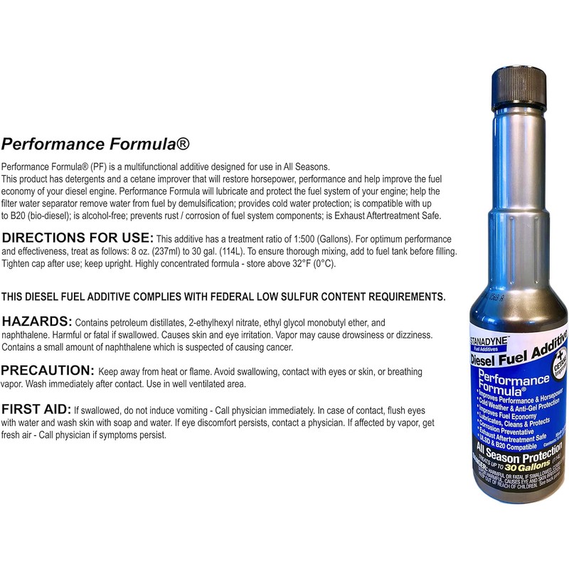 **Authorized Stanadyne Dealer:** 1) Diamond Diesel & Turbocharger Service **Advantages of using Performance Formula** **1)Restores/Increase Horsepower** – detergents clean deposits in the injection system resulting in improved combustion, better acceleration, power, and torque **2)Reduces Fuel Consumption** – independent tests show an average of 4% improvement in MPG and gains up to 9.6% **3)Cetane Improver** – improves combustion resulting in better engine starting, smooth running, and reduced engine noise **4)Meets all engine fuel system requirements** \-- will not harm exhaust aftertreatment systems **5)Reduces Emissions** – reduces Smoke and Particulates **6)Cleans and Protects** – detergents and deposit modifiers help protect injection pumps, injectors, nozzles, etc. **7)Reduces Wear** – lubricity improvers restore lubricity to ultra low sulfur and other low lubricity diesel fuels **8)Stabilizes Fuel** \- keeps fuel fresher and protects against formations of gums caused by oxidation **9)Cold Weather Protection** – improves diesel pour point up to 40°F (22°C), and cold filter plug point by up to 25°F (13°C), depending on base fuel **10)Corrosion Preventative** – Corrosion inhibiters will protect the fuel system from rust and corrosion **11)Helps Remove Water** – special demulsifiers cause tiny water droplets to come out of suspension/emulsion, so the filter/separator can more effectively remove water **12)Contains No Alcohol** – avoids corrosion and accelerated wear **13)Specially Formulated** \-- for use with ultra low sulfur diesel fuel Can be used with Bio Diesel Fuel up to B20 (20% bio content approved ) – increased water separation shown in bio content up to B20 SHIPPING RESTRICTION: STANADYNE DIESEL FUEL ADDITIVES ARE CONSIDERED A HAZARDOUS MATERIAL. GROUND SHIPPING ONLY! NO EXCEPTIONS