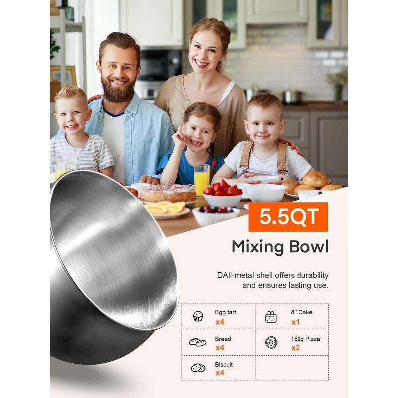 - Large Capacity 5.5Qt Bowl - The 5.5 Qt stainless steel mixing bowl with handle is easy to clean after use and easy to use and clean for making cake, bread, biscuit, pastry, muffin and waffles. Features a head that tilts backward and comes with a standard safety lock feature to ensure it doesn't power up unless all components are securely fastened. Silicone suction cups on the bottom keep the machine in place when working