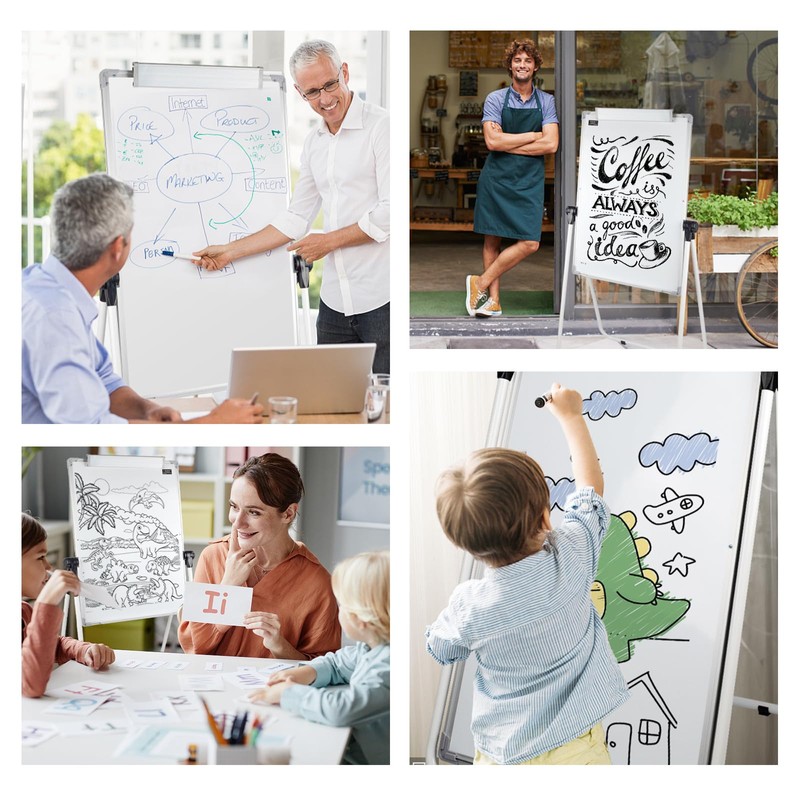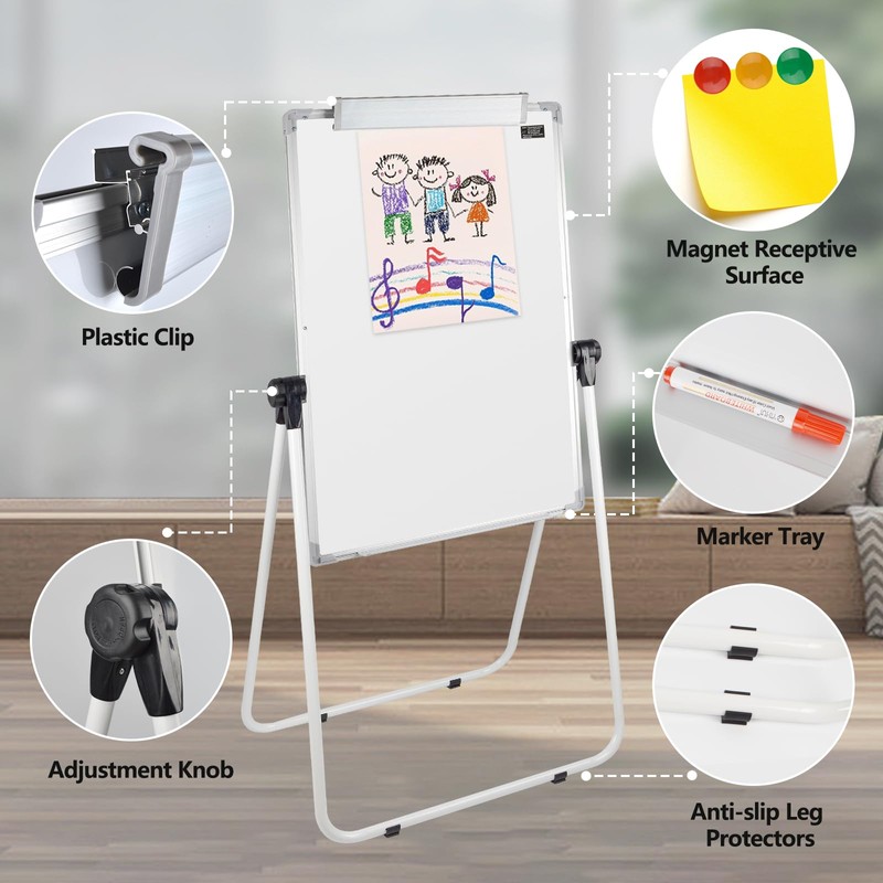 - HUMANIZED DESIGN: It featured a steel elastic clip on top of the magnetic white board for hanging note books, charts, documents, posters, calendars as a flip chart easel. A movable tray at the bottom to hold dry-erase markers and erasers. The lightweight and compact folding size makes this whiteboard stand easy to store and transport.