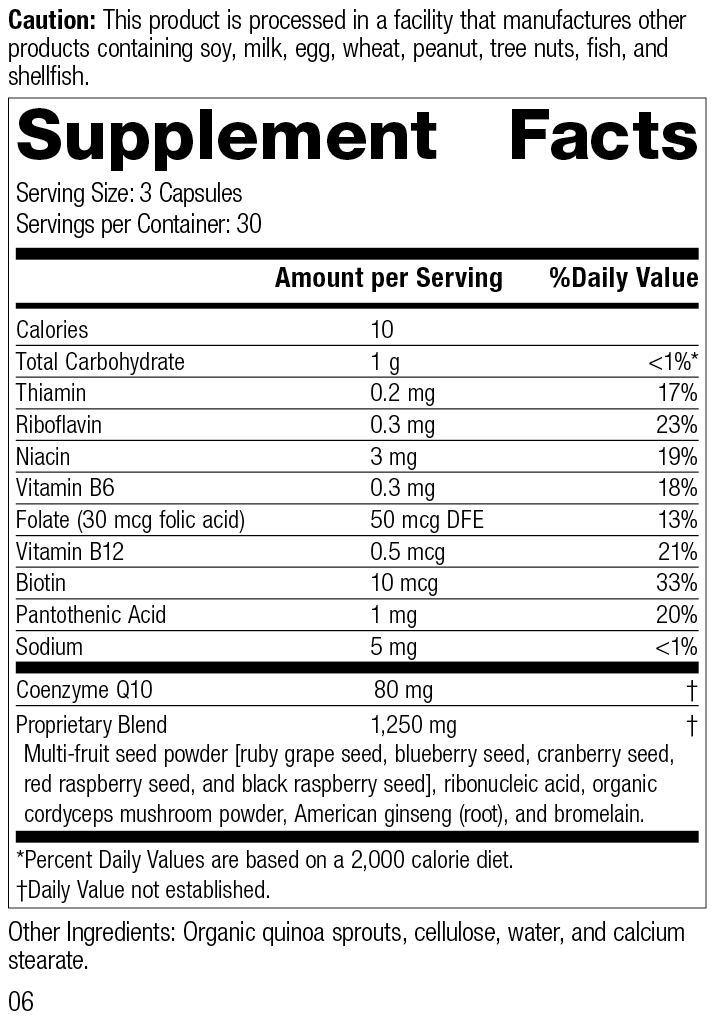 • Ingredients: Each Serving Size (3 Capsules) contains: Calories 10, Total Carbohydrate 1 g, Thiamin 0.2 mg, Riboflavin 0.3 mg, Niacin 3 mg, Vitamin B6 0.3 mg, Folate (30 mcg folic acid) 50 mcg DFE, Vitamin B12 0.5 mcg, Biotin 10 mcg, Pantothenic Acid 1 mg, Sodium 5 mg <1%, Coenzyme Q10 80 mg. Proprietary Blend 1, 250 mg: Multi-fruit seed powder [ruby grape seed, blueberry seed, cranberry seed, red raspberry seed, and black raspberry seed], ribonucleic acid. For the full list see Fact image.