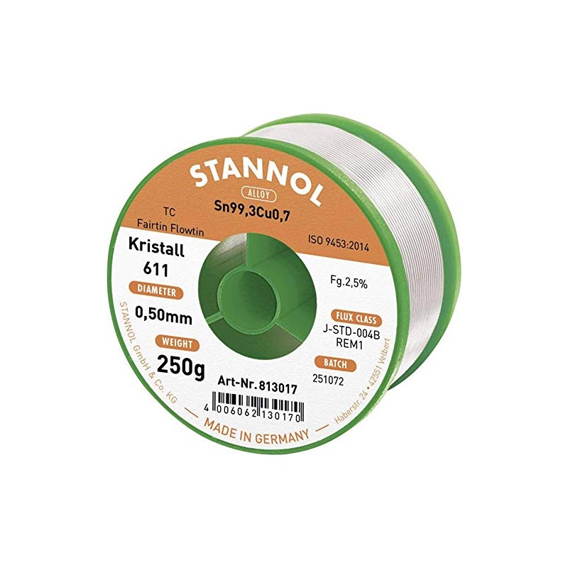 Stannol 813017 Soldering Wire Crystal 611 2.5% 0.5 mm Flowtin TC (Sn99.3Cu0.7) Fairtin 250 g Spool
