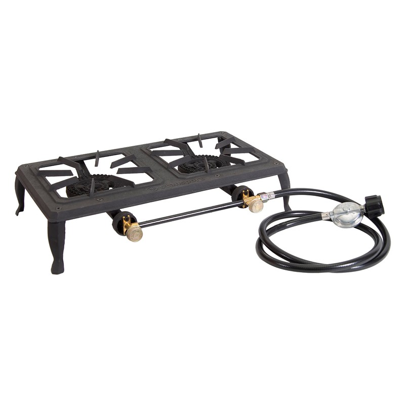 - Double Burner Cast Iron Stove is great for cooking those special outdoor meals. It features include 2 high output 15000 B.T.U. burners for 30000 total B.T.U. It features brass valves and a sturdy cast iron frame that is powder coated and painted for long lasting durability. Hose and regulator needed for operation, sold separately.